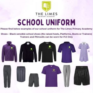 Our uniform, worn by all the children, is a distinctive feature of The Limes Primary Academy. We place an emphasis on maintaining high standards of dress and appearance because we believe it encourages the children to take pride in themselves and their Academy. We, therefore, ask parents to ensure that their children always wear the correct uniform and that it is clearly labelled. Children also need to wear the appropriate kit during PE lessons.